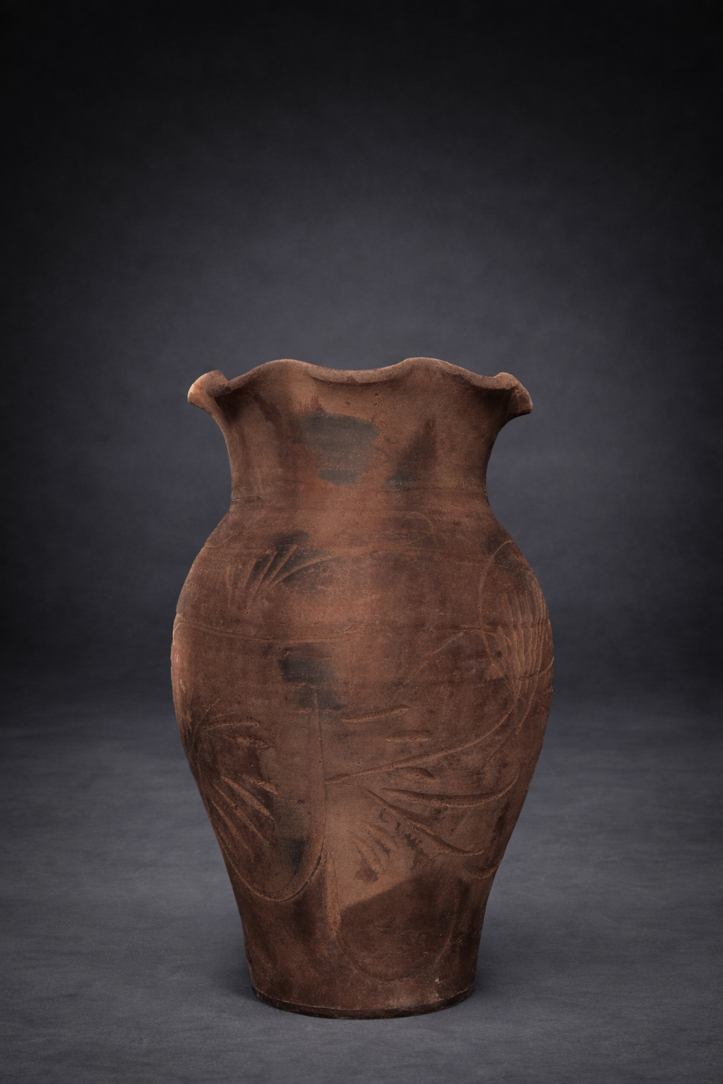 Handgjord terrakottavas med mörk, rustik yta och elegant form. Den dekorativa designen skapar en varm och exklusiv känsla perfekt som blickfång i hemmet eller på uteplatsen.